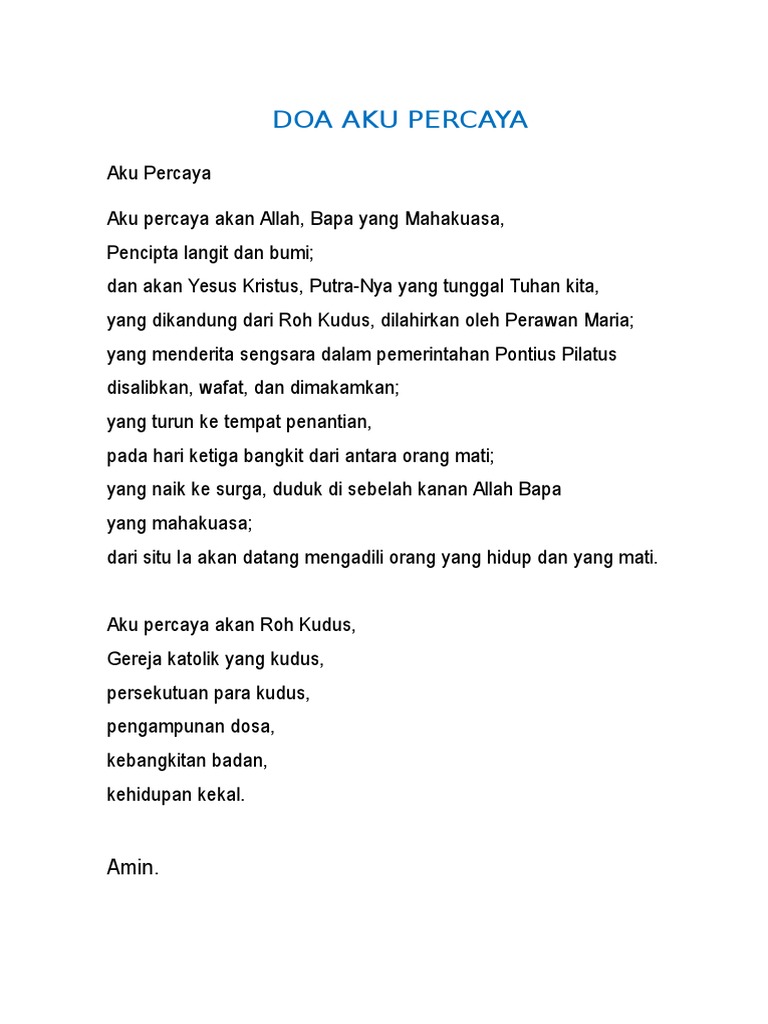 Doa Aku Percaya Katolik - Doa Aku Percaya Dalam Bahasa Inggris Dan Indonesia Musafir Notes. Aku percaya akan roh kudus, gereja katolik yang kudus Itulah beberapa contoh doa katolik ketika sedang mencari kerja atau memohon pertolongan tuhan agar lamaran kita cepat diterima untuk bekerja. Dan akan yesus kristus puteranya yang tunggal, tuhan kita, yang dikandung dari roh kudus dari situ ia akan datang, mengadili orang yang hidup dan yang mati. Aku percaya aku percaya akan allah, bapa yang mahakuasa, pencipta langit dan bumi; Syahadat ini menjadi awal dari rumusan dasar gereja yang dibuat dengan amanat yesus untuk menjadikan segala bangsa muridnya.